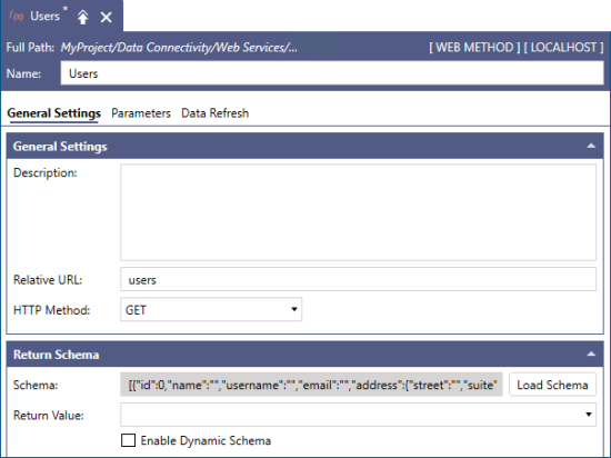 - Enter a name of the web method. To follow the example, name it Users.