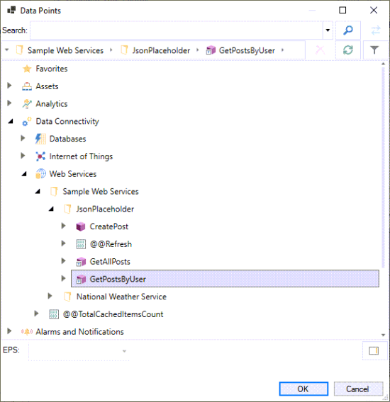 Go to Data Connectivity > Web Services, expand the folder containing the desired service JsonPlaceholder, select the desired web method GetPostsByUser, and then click OK.