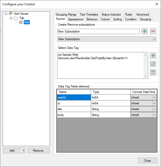 When the tag for the selected web method, including parameters, appears in the Select Data Tag box and the web method columns and data types appear in the Data Tag Fields retrieved area, click Close.