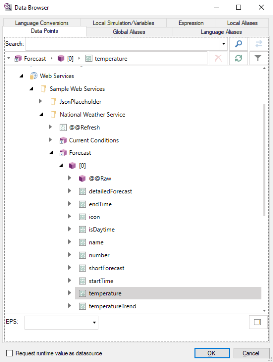 Go to Data Connectivity > Web Services, expand the desired folder and web method (National Weather Service > Forecast), expand the web method's return schema (0), select the desired property (temperature), and then click OK.