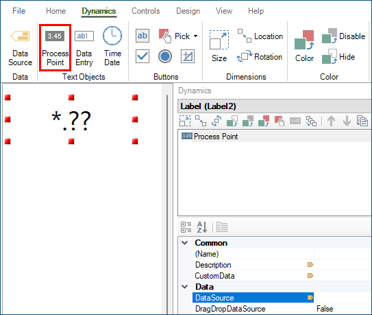 On the Dynamics ribbon, select Process Point, and then drag the mouse diagonally across the canvas to make a rectangle for inserting the process point. The process point is added to the screen and in the Dynamics pane on the right, a property grid is displayed with the Data Source box pre-selected.