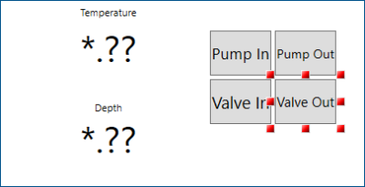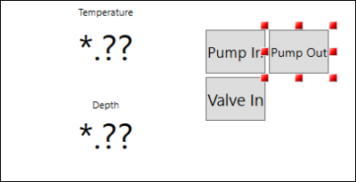 To the right of the process points, you will first add the Pump Out control button (Pump 01—Output), which turns the input pump on or off. Then, below the Pump Out button, you will add the Valve Out control button (Valve 01—Output), which opens or closes the selected output valve.