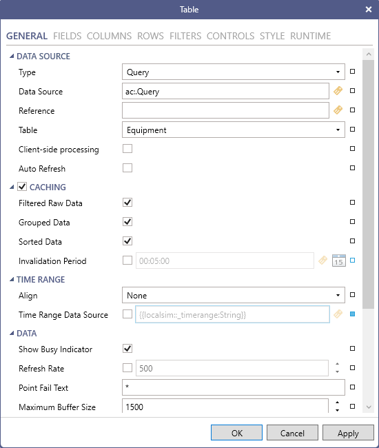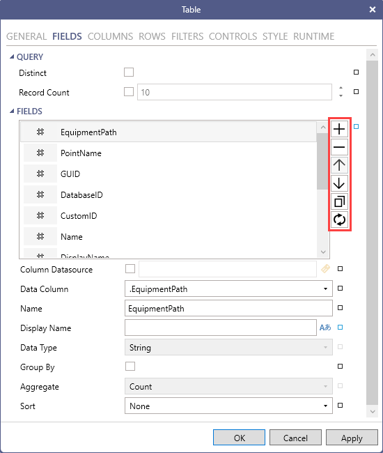 next to the column list to load the columns available for your query. Optionally, customize the settings for each column as desired. Use the button menu to add, remove, or copy columns and change the order in which they appear in the table. - Modify the remaining table settings as desired and click Apply, and then click OK to close the configuration.