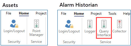 For some components, such as Assets, the primary service for the point manager implicitly supports the query interface, while for other components, such as Alarm Historian or BACnet, you need to start a separate query interface service, as shown in the image.