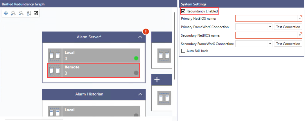 In System Settings, select Redundancy Enabled. This adds another (Remote) connection to the Alarm Server cluster.