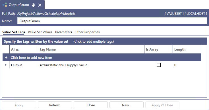 On the Value Set Values tab, select Click here to add new item to add a new value to be written to the Output tag mapped to the parameter, and enter the value's name in the Name column.
