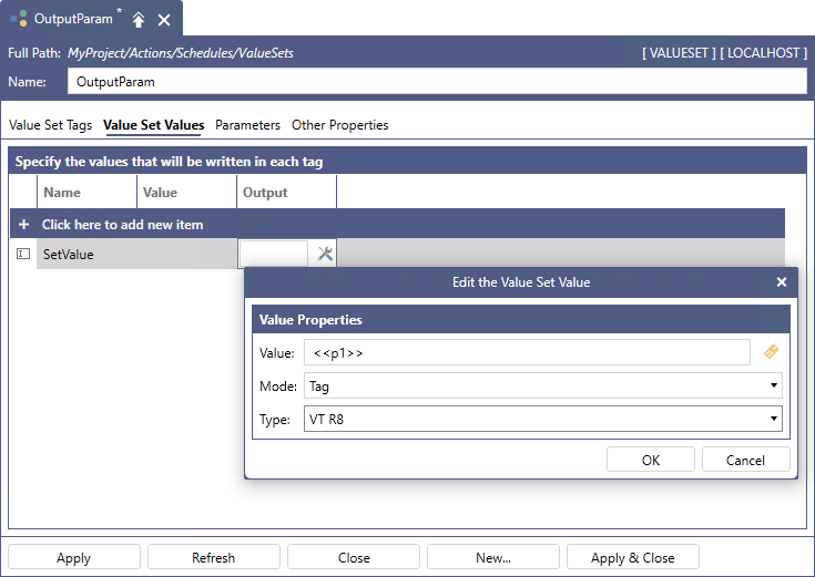 to open the Value Properties dialog. Set up the properties as follows, and then click OK.- In Value, enter the parameter name (p1) enclosed by << and >>.